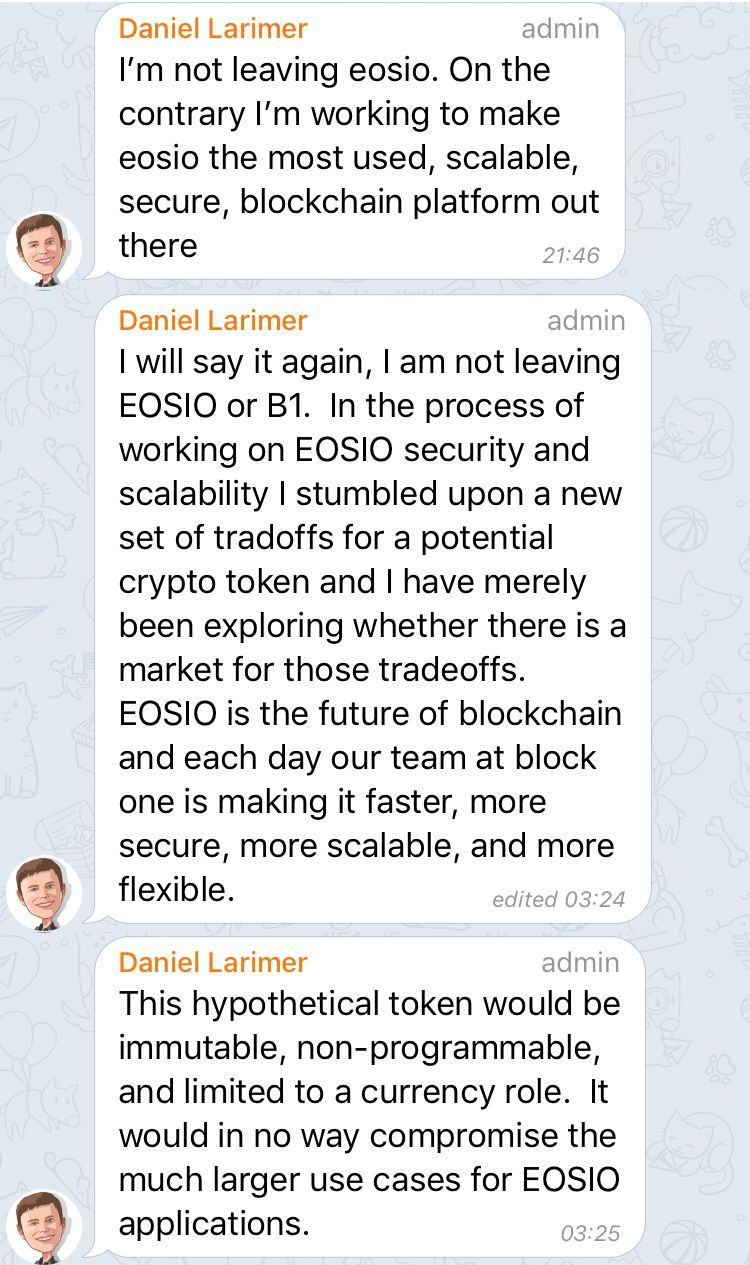 我重申,我不会离开EOSIO或Block.one。在处理EOSIO安全性和可扩展性的过程中,我偶然发现了潜在的加密代币,而我只是在探索是否有它存在的市场。EOSIO是区块链的未来,而Block.one的团队每天都在使其更快,更安全,更具扩展性,以及更灵活。