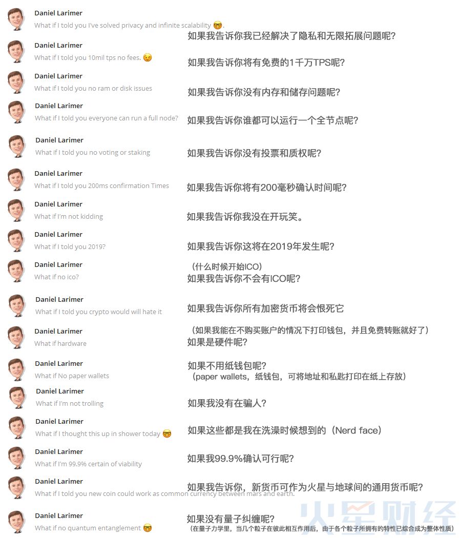 11月28日,Dan Larimer(BM、@daniel larimer)在EOS电报群发声,在回应网友(@realtequila)对区块链技术应用场景的质疑,以及对技术的公开性与隐私问题的讨论中反问:What if I told you I’ve solved privacyand infinite scalability?(如果我告诉你我已经解决了隐私和无限拓展问题呢?)并由此引发了BM携众网友对区块链技术的展望和遐想,以及引发热议的BM一连串“What if”。火星财经(ID:hxcj24h)梳理了当天BM所有的“What if”展望: