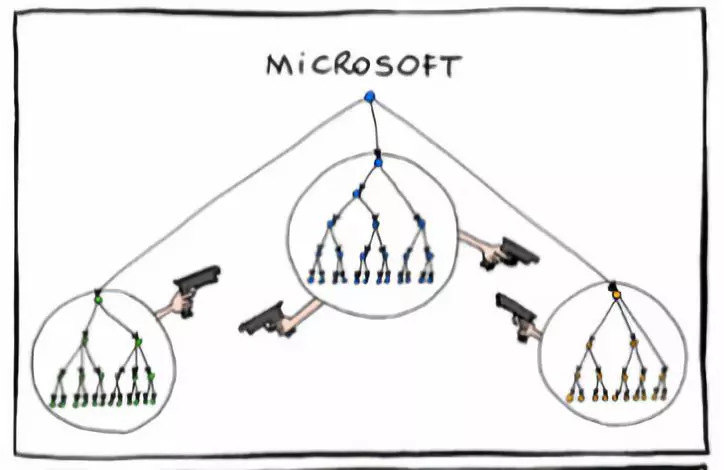 程序员兼漫画家 Manu Cornet 曾在 2011 用漫画总结了微软的组织架构图,图上,微软的各个部门之间举枪相向。