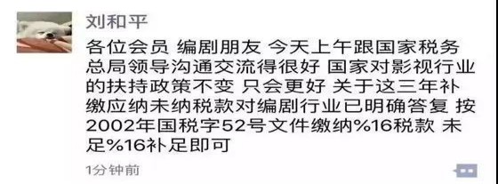 针对“影视行业补税”一事,《雍正王朝》、《北平无战事》等优秀电视剧的编剧刘和平朋友圈发文表示:今天上午跟国家税务总局领导沟通交流得很好,国家对影视行业的扶持政策不变,只会更好,关于这三年补缴应纳未纳税款对编剧行业已明确答复,按2002年国税字52号文件缴纳16%税款,未足16%补足即可。