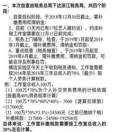 文中称,此次自查自纠规定,“工作室需要按照2016年至2018年三年总收入的70%(最少)按个人劳务计算税款,需补缴费用和滞纳金”。在随后的3天内,浙江已有17位艺人被约谈,补税工作需要在12月15日前完成。