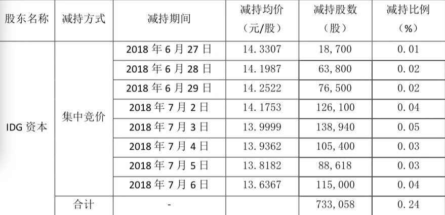 早在2018年1月31日,全聚德发布公告称,IDG资本计划在本公告披露之日起3个交易日后的6个月内以集中竞价交易、大宗交易和协议转让方式减持所持公司18102824股股份(占公司总股本比例为5.87%),减持原因仍为资金安排需要。不过,根据全聚德8月7日发布的公告,此次减持计划实施期间IDG资本共减持了公司股份733058股,占公司总股本比例0.24%。