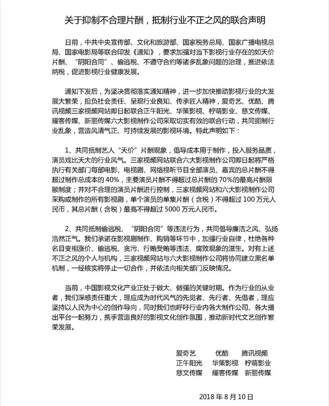 慈文传媒、正午阳光、柠萌影业和腾讯视频四家坐在一起,一个逃不开的话题就是2018年8月10日的那份联合声明。