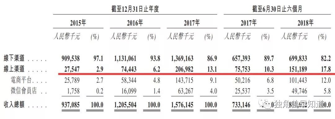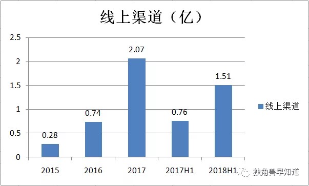 经调查,线上渠道是当前公司增长最快的分部,其中包括传统电商和微信两个平台。线上渠道收入由2015年的0.28亿元人民币增长至2017年的2.06亿元人民币,并进一步增长至2018年上半年的1.51亿。比例由2015年的2.9%增长至2018年的17.7%,其中销售收入最高的是天猫商城的旗舰店。