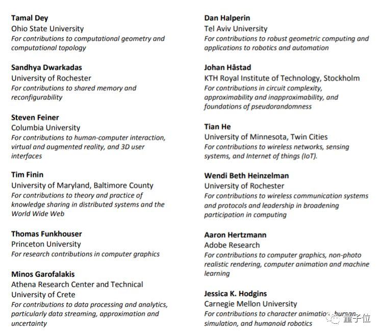 下面是全部入选者名单,他们来自芬兰,希腊,以色列,瑞典,瑞士和美国的高校、企业和研究中心,主要贡献在于可访问性、AR、算法博弈论、数据挖掘、存储、软件和万维网等领域。