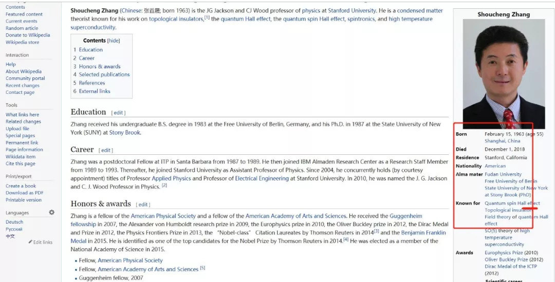 据Wikipedia,张首晟教授出生1963年2月15日,卒于2018年12月1日,终年55岁。1978年考入复旦大学。1980年赴德国柏林自由大学留学,1983年获硕士学位。后赴美国纽约州立大学石溪分校深造,1987年获博士学位。毕业后在加州大学圣芭芭拉分校从事博士后研究。后前往IBM担任高级研究人员。1993年起任教于斯坦福大学。1999年被聘为长江学者讲座教授,任清华大学高等研究院客座教授。2004年出任IBM-斯坦福自旋电子学研究中心主任。