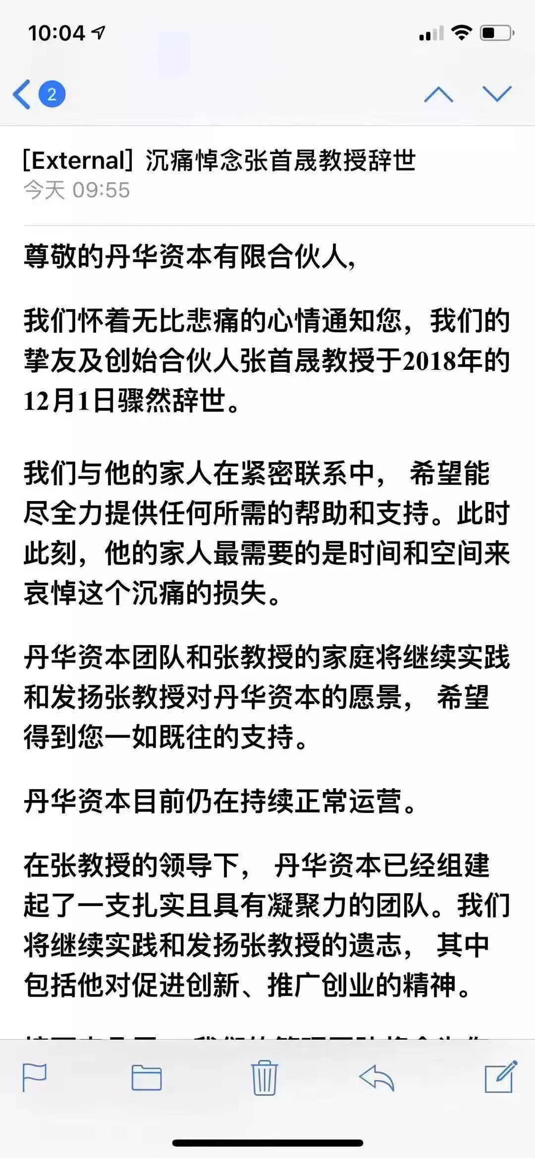 丹华资本在发出的邮件表示:“我们与他的家人在紧密联系中,希望能尽力提供任何所需的帮助和支持”,“在张教授带领下,丹华资本已组建起了一支扎实且具有凝聚力的团队。我们将继续实践和发扬张教授的遗志,其中包括他对促进创新、推广创新的精神”。