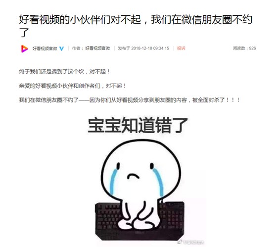 12月10日,百度好看视频在官方微博上发文《好看视频的小伙伴们对不起,我们在微信朋友圈不约了》,称其产品分享至微信朋友圈的内容已被全面封杀。