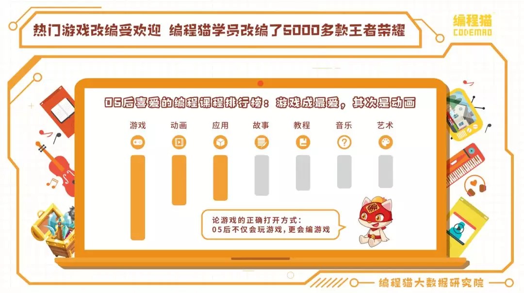 编程猫报告显示,05后最喜欢的编程形式中,游戏第一,动画第二,应用第三,教程、音乐、故事等排在后面。这表明,游戏化编程会是少儿编程的发展方向。相对于传统的基于图形化语言学习的编程教育而言,游戏化编程教育将编程语言学习变成游戏关卡,学习者通过输入代码指令来引导角色过关,最开始是零门槛,难度不断增加,而游戏的过程编程知识在逐步扩展。