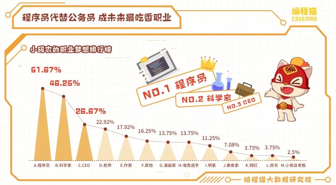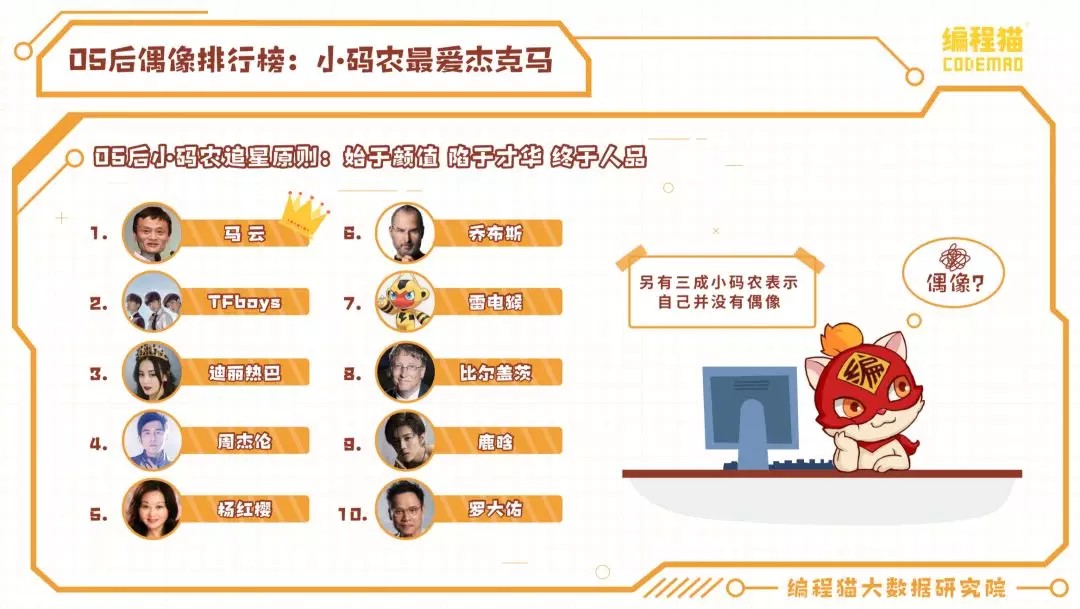 最近国内突出的少儿编程教学和创作平台编程猫发布了一份名为《码农新势力的崛起》的大数据报告,报告显示,青少年中最受欢迎的偶像不是TFboys这样的流量明星,而是马云,此外,乔布斯、比尔盖茨也是他们的偶像。