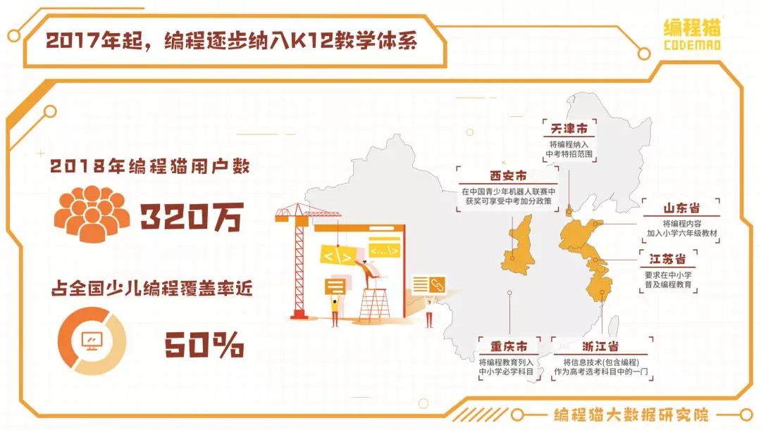 近年来,我国政府从顶层设计上对少儿编程教育给予支持。国务院《新一代人工智能发展规划》指出,人工智能成为国际竞争的新焦点,应逐步开展全民智能教育项目,在中小学阶段设置人工智能相关课程、逐步推广编程教育、建设人工智能学科,培养复合型人才,形成我国人工智能人才高地,在这样的大环境下,越来越多地方将编程教育纳入K12教育体系。编程猫报告显示,2017年起,天津、西安、山东、江苏、重庆和浙江等地已经将编程教育纳入K12体系。