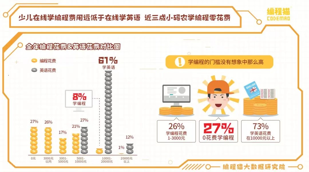 还有很重要的一点是,少儿编程是最便宜的课外学习。编程猫报告显示,73%的学生在线学英语花费在10000元以上,但26%在线学习编程的学生,花费在3000元以内,27%的甚至是免费学编程。正是因为此,课外教育机构也有推广少儿编程的动机,毕竟不需要增加家长的经济负担,就可以强化素质教育,在当前教育改革的大环境中,机构也都不希望自己沦为“考试机器培训班”。