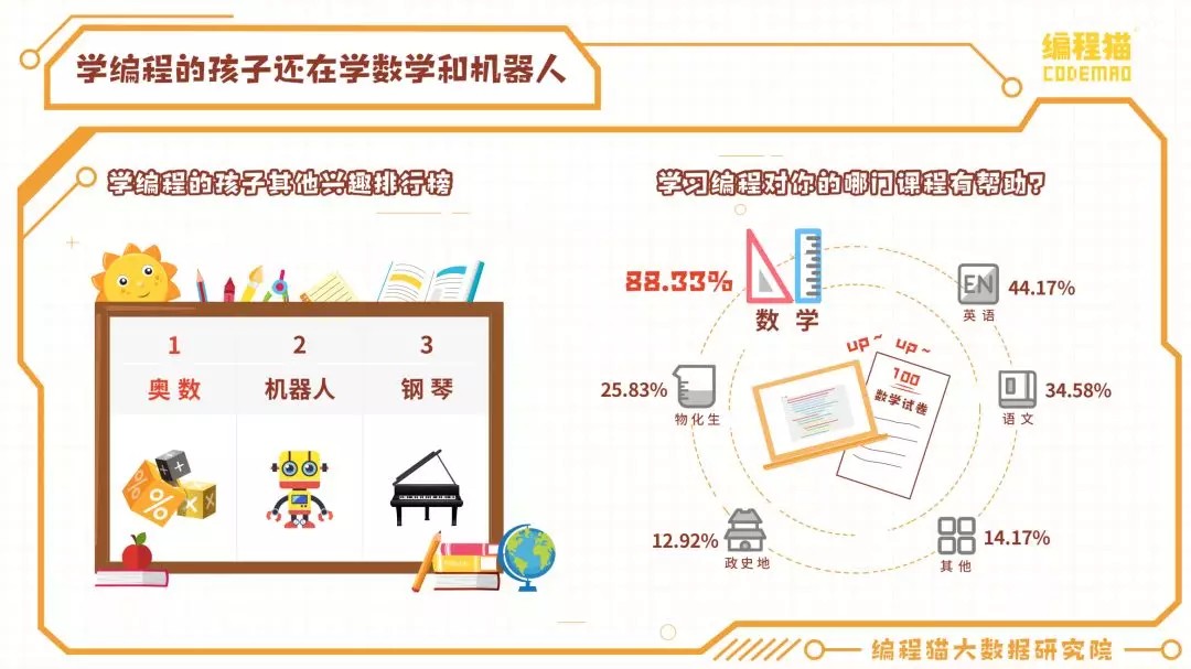 编程猫报告也显示,现在接受少儿编程训练的,89.58%是自我兴趣使然,而不是被父母逼迫,这与很多小朋友在父母的意志下(或许不是被逼的,但很可能是要讨家长欢心)学习各种五花八门的课程的动因截然不同。