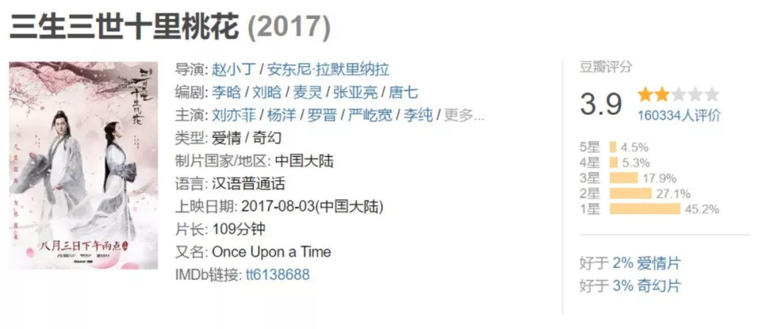 这些项均未给阿里带来亮眼的成绩,票房。不仅如此,大手笔投入的项目口碑却不好,甚至一度被「群嘲」。诸如:由顶级流量杨洋和刘亦菲主演的电影《三生三世十里桃花》,豆瓣电影评分仅 3.9 分,近一半的评论给这部电影打了「1」分。同时,它还被众多网友质疑演技,吐槽 IP 抄袭。