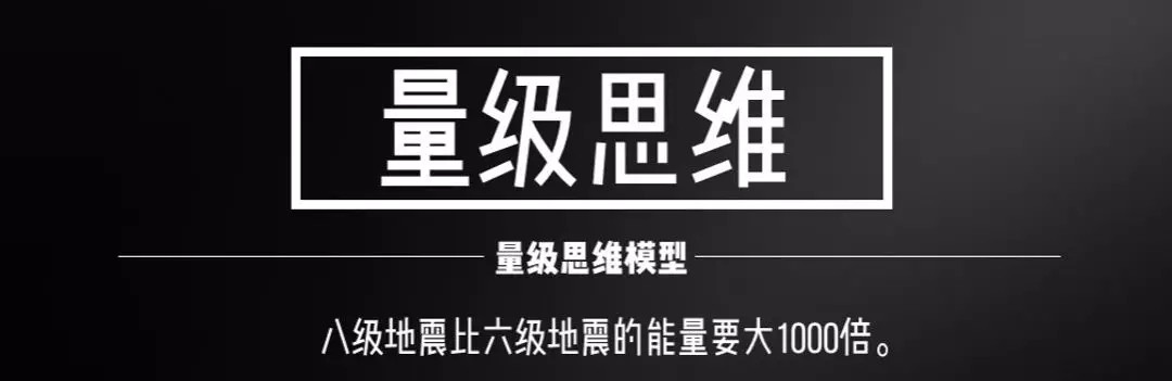 持续地改良之后,量变就会引发质变,我们就会生上到一个新的量级。这里要和大家分享一下量级思维。什么是量级思维?八级地震和六级地震相比,数量上虽然只差两级,但能量却相差一千倍不止。同理,月薪五千和八千区别不大,但月薪50万就是质的区别。