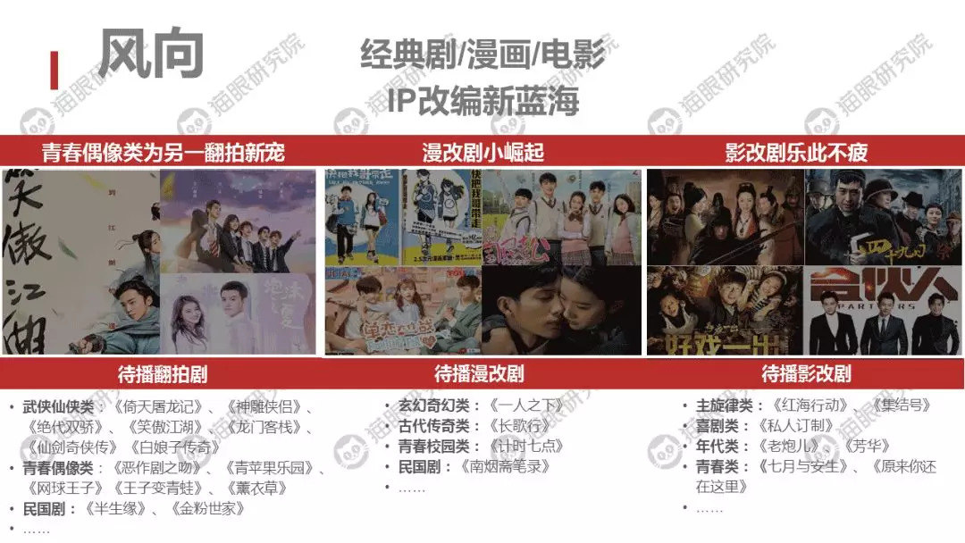 2018年的翻拍市场炙手可热,其中以经典武侠、青春偶像作品为主阵地,猫眼研究院《年度报告》显示,《倚天屠龙记》《神雕侠侣》《绝代双骄》《笑傲江湖》《龙门客栈》等已经每隔几年就会出现在翻拍剧名单中的热门经典古装武侠剧均在待播片单之列,堪称90后童年回忆的《恶作剧之吻》《青苹果乐园》《网球王子》《王子变青蛙》《薰衣草》等剧目亦进入待播阵营。