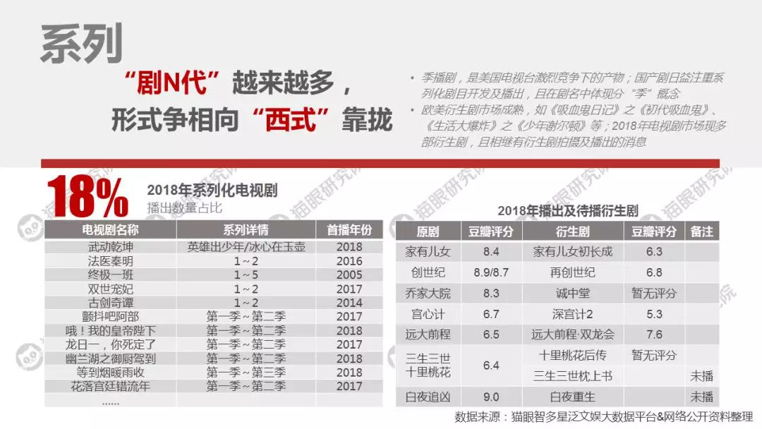 猫眼研究院《年度报告》数据显示,2018年网生内容“西化”趋势显著,积极吸纳适合网络剧发展的编播模式探索精神值得肯定,但与此同时需要注意的是“季播”概念能否真正落地,以及剧N代的出现,到底是对IP价值的继续开掘,还是对IP价值的变相压榨,新剧观察(ID:xinjuguancha)对此仍持观望态度。原因有两点:第一,在网台竞争马太效应加剧的环境下,电视台丧失购买力,以及相关政策的影响,一部分剧目播出渠道由台转网,与此同时为消耗积压库存,制片方将积压剧转投视频平台,按照周播剧模式创作的内容强行以“季播”的方式进行播出,并未突出季与季之间衔接的特点,造成“伪季播”的隔膜感; 第二,衍生内容的开发,归根结底是对IP价值的持续挖掘,IP本身的虚火如何加以分辨,衍生内容的受众天花板何时触达,单就片方与平台“王婆卖瓜”式的奔走呼告播出成效显然不可照单全收,最终还是需要纳入量化的综合评定方式,才能使“衍生剧”的开发具有真正的意义。