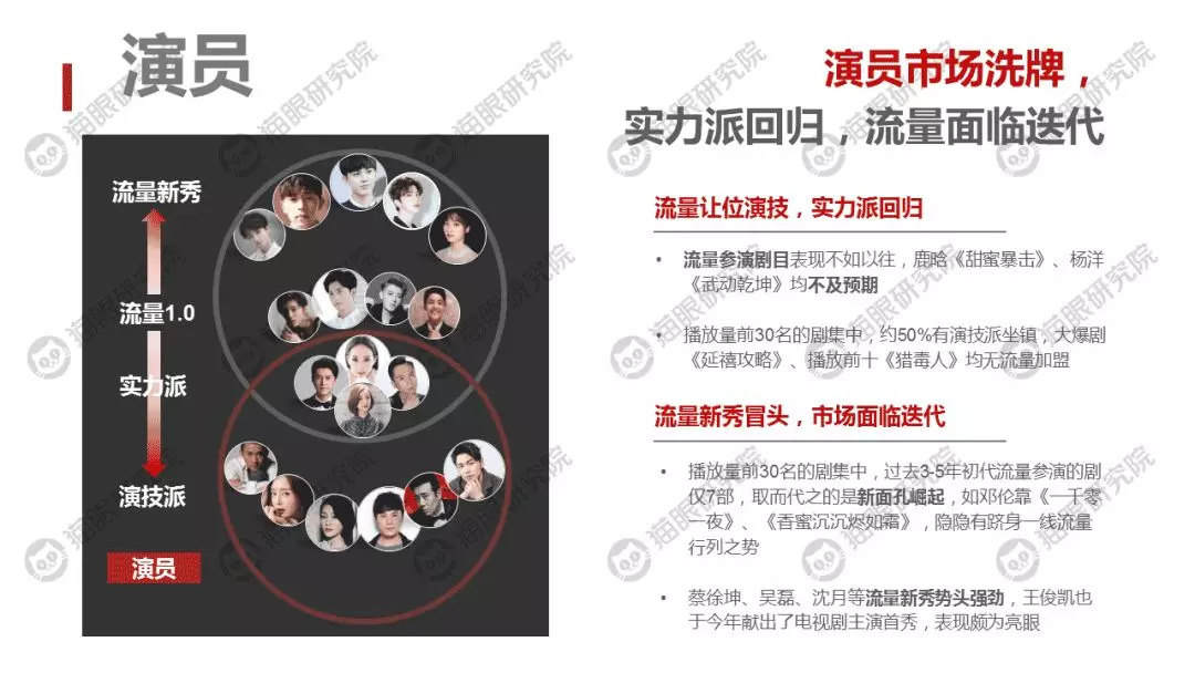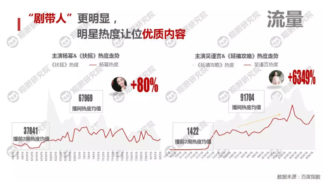 如果说整个2018年电视剧市场最值得彪炳且大快人心的事件,就应当是流量明星的失灵和IP的哑火,这是整个市场在近5年时间的盲目冲动中停下脚步回归理性的表现。猫眼研究院《年度报告》数据显示,《扶摇》《延禧攻略》等剧目在播出期间,,以前大家依靠“人带剧“,现在反而是”剧带人“,明星热度让位优质内容成为一种新现象。