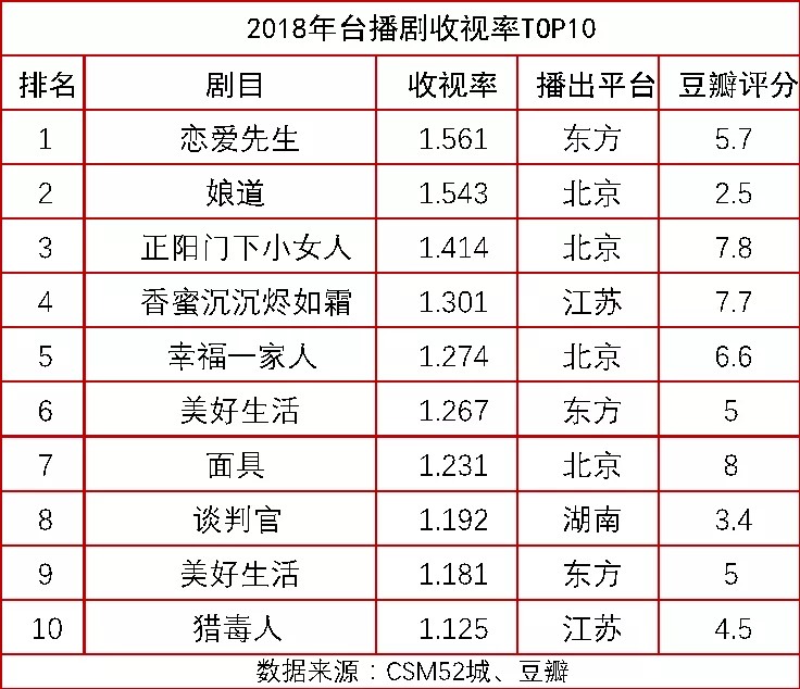 根据猫眼研究院《年度报告》数据显示,2018年剧集口碑与收视倒挂现象在台播剧以及古装剧中最为显著,台播剧平均播放量已经达到23.7亿次,但是豆瓣评分平均分只有5.7,连及格线都没有达到;古装剧平均播放量为22.9亿次,豆瓣评分6.0,勉强及格,收视与口碑倒挂背后的症结不容忽视。新剧观察(ID:xinjuguancha)在此基础上又找出了年度平均收视率top10的剧目,其收视与口碑倒挂现象更令人瞠目:在10部剧中,有6部低于6分的及格线,过半数口碑失格,且在收视数据上看,也远不及2017年《人民的名义》等作品造就的收视“奇迹”。综合来看,口碑和收视、点击展现的集体失手,是观众和市场向从业者敲响的一记重锤。解决电视剧做给谁看的问题是扭转收视与口碑倒挂现象的行之有效途径。