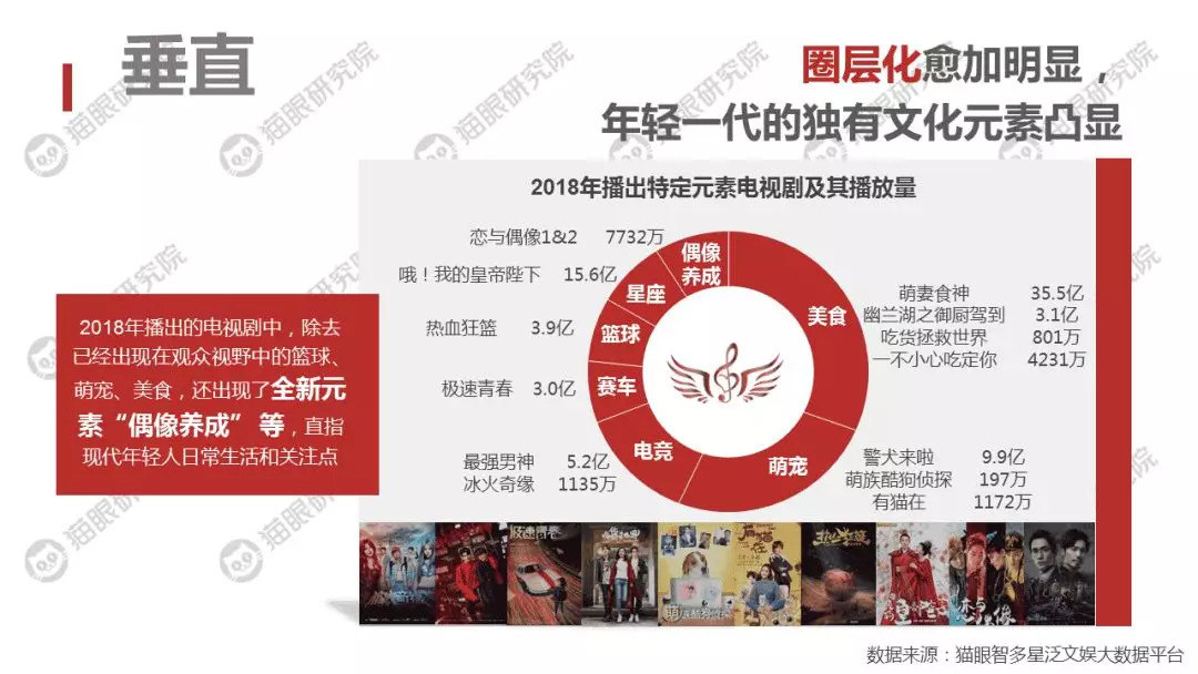 猫眼研究院《年度报告》分析显示,2018年电视剧市场“圈层化”现象愈加明显,”偶像养成”等新一代观众日常生活关注的独特娱乐文化元素在作品中日益凸显。
