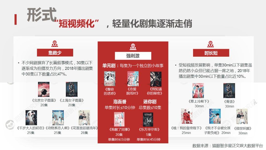 网络剧集将体量压缩,一方面由于视频网站给出了除了广告收益之外的其他盈利模式,如优爱腾三家视频网站均在布局的分账策略,能够令制片方不再依靠单纯的拖长剧情拉动经济收益。另外一方面,视频平台的用户更加年轻化,受到欧美日韩等剧目的滋养,对于内容节奏有着更高的要求,对短平快、脑洞大、情节点密度高的内容有着天然的亲近感。加之视频平台网络自制内容多采用周播的形式进行播出,每周更新2-3次的,4-6集的播出体量以及会员提前看的模式与短小精悍内容适配度更高。猫眼研究院《年度报告》数据显示,《北京女子图鉴》《上海女子图鉴》《动物系恋人啊》《千岁大人的初恋》《花落宫廷错流年》等剧目集数均压缩在30集以内,播出周期在2-3个月之间,是对用户观剧习惯的培养和适应。