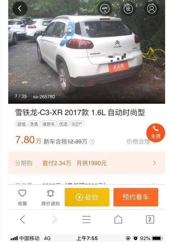 据网友@天降大任 的截图,早在9月,途歌便开始“网上卖车”,在某二手车网站“急售”一辆雪铁龙C3-XR。