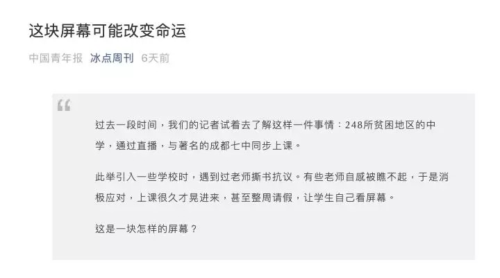 一则《这块屏幕可能改变命运》的新闻刷屏,让互联网教育成了津津乐道的话题。贫困县的农村学生,通过网络直播课,接受到顶级中学的优质教育,最终成功考入名校,给我们描绘了一幅网络技术改变农村命运的美好场景。