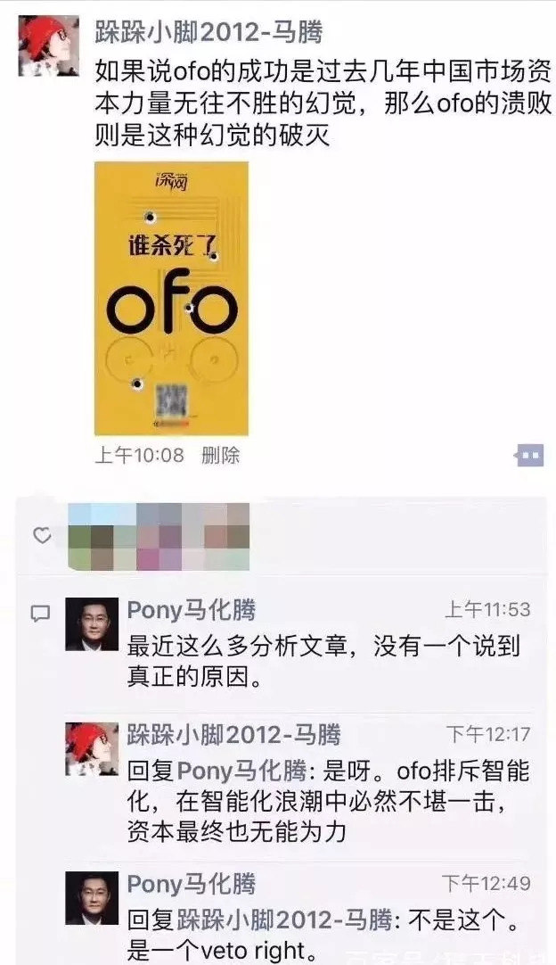 马化腾评ofo溃败原因 :veto right (否决权)问题
