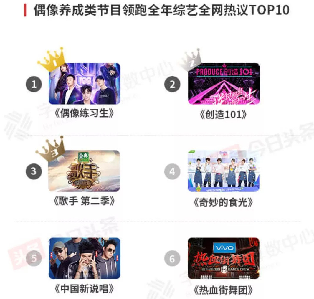 从整个综艺市场来看,今年养成偶像节目备受关注,相关节目播放量超过134亿,在综艺播放总量中占比12%。全网综艺热议TOP10中,《偶像练习生》和《创造101》登顶,而全网热议的TOP50艺人中有近三成是养成偶像,如蔡徐坤、陈立农、孟美岐、杨超越等,这些都是被粉丝PICK出的新一代偶像。