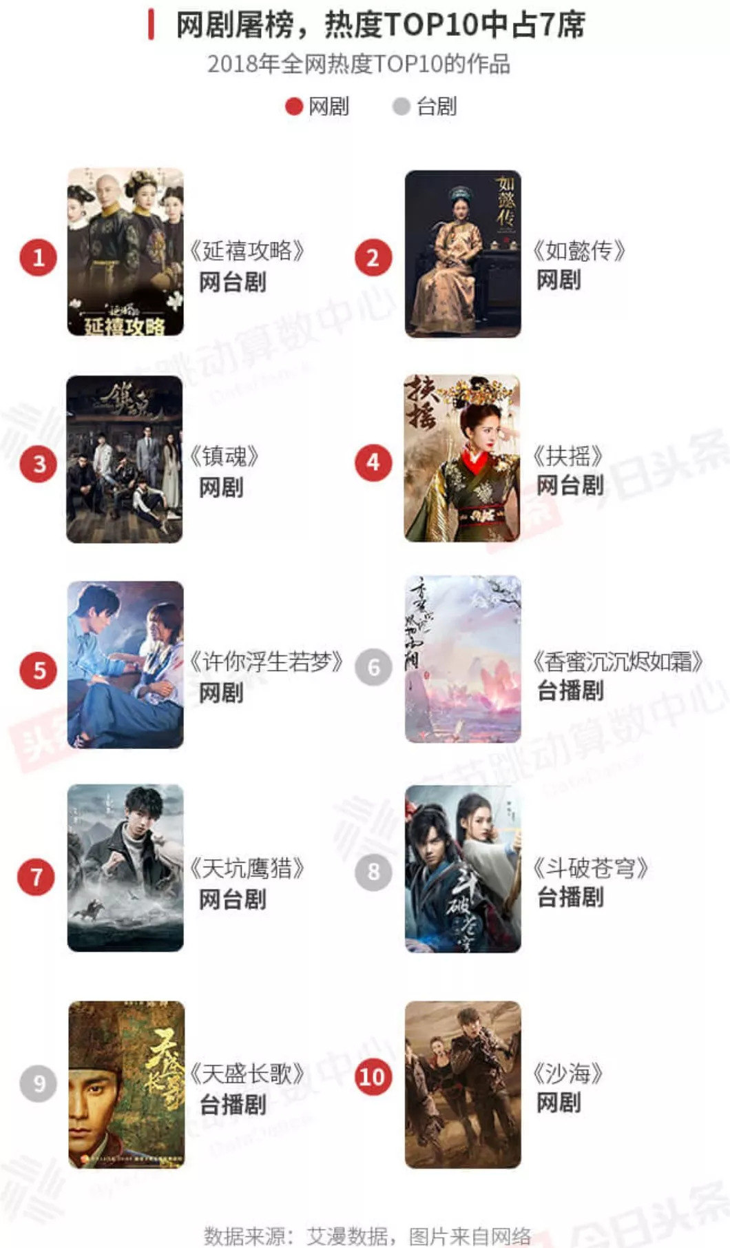 随着视频网站对网剧投资成本的加大和制作团队的扩充,今年网剧表现抢眼。三大视频网站独播剧占全年剧集总量比例从2016年的45%提升到了2018年的64.5%,2018年全网热度TOP10剧集中,网剧或先网后台的剧集占据了7席,如《延禧攻略》《如懿传》《镇魂》《扶摇》等。此外,随着《忽而今夏》《假如没有遇见你》等口碑网剧的出现,今年口碑TOP5网剧平均播放量达到台剧的近两倍。