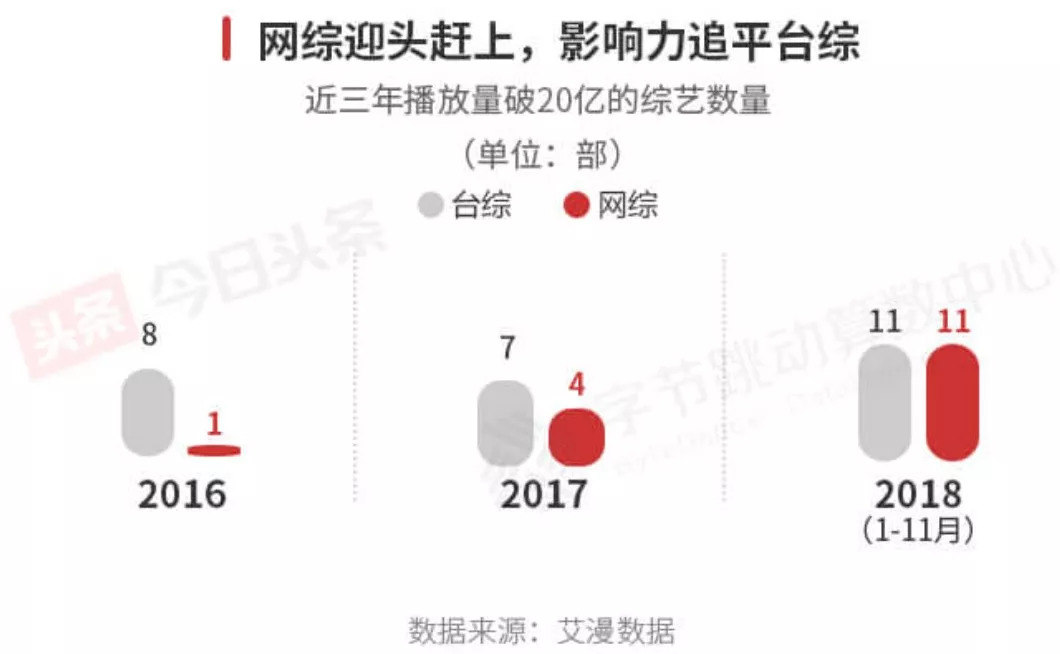 电视剧与综艺领域的2018年,就是网剧网综上行,台剧台综发展趋缓的一年。三大视频网站付费用户2018较2016增量普遍超过100%,用户越来越习惯花钱来消费自己喜欢的内容。电视台则陷入了瓶颈期,惯用法宝“大IP+大流量明星”法则失灵后,今年16部台播IP中仅《香蜜沉沉烬如霜》一部收视率破1,“爆款缺失”成为今年整个行业的热门议题。