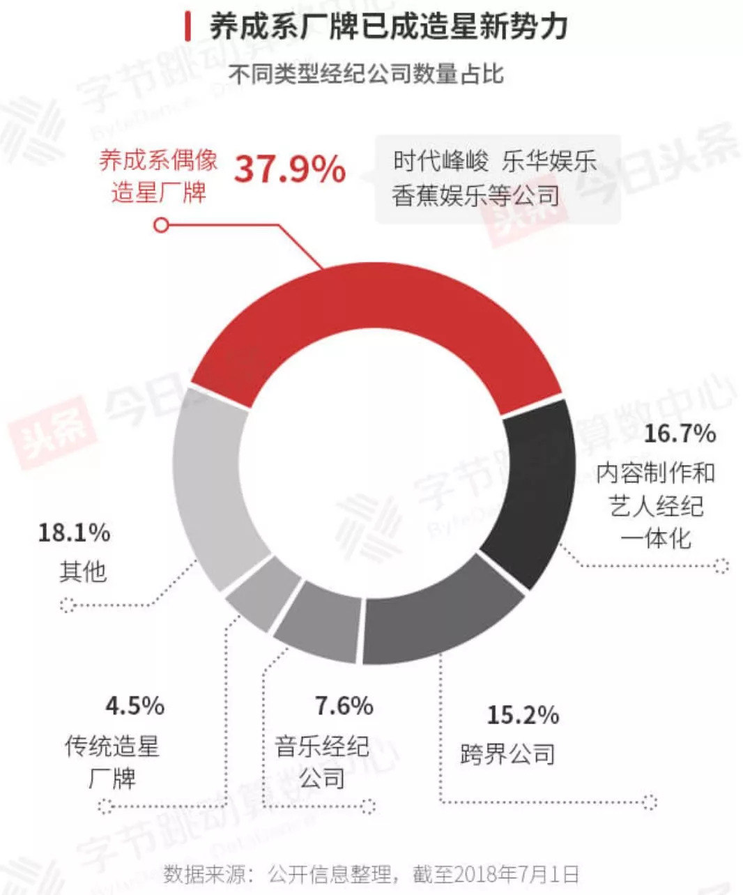 偶像产业迎来高速发展,主力造星平台也正在从传统的艺人经纪公司过渡到专业厂牌,如乐华娱乐、时代峰峻、丝芭传媒等,这些养成系偶像造星厂牌今年在整个市场数量占比已经达到了37.9%,而集内容制作和艺人经纪一体化的传统公司占比仅有16.7%。此外,造星厂牌输出艺人集中度提高,第一梯队造星厂牌今年输出新偶像占比高达40%。
