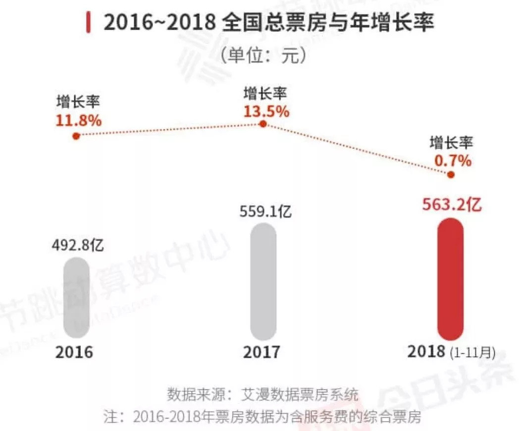 2018年,电影市场票房增速放缓,从2016年11.8%的增长率下滑至了1-11月份的0.7%,全国观影人次更是从2016年8.9%的增长率下滑至了今年1-11月份的-1.8%。票房增速趋于理性后,近几年高速扩张的院线迎来了饱和,纵向下沉趋势结束,今年,全国院线增长率从2016年的26.9%下滑至了12.5%,银幕数量从2016年的30.2%下滑到了16.2%。