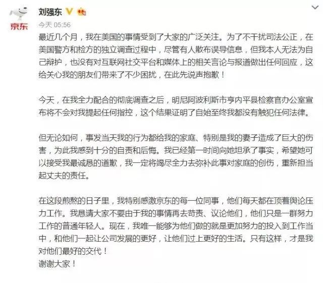 美国检方决定不予起诉刘强东,本人发声明致歉