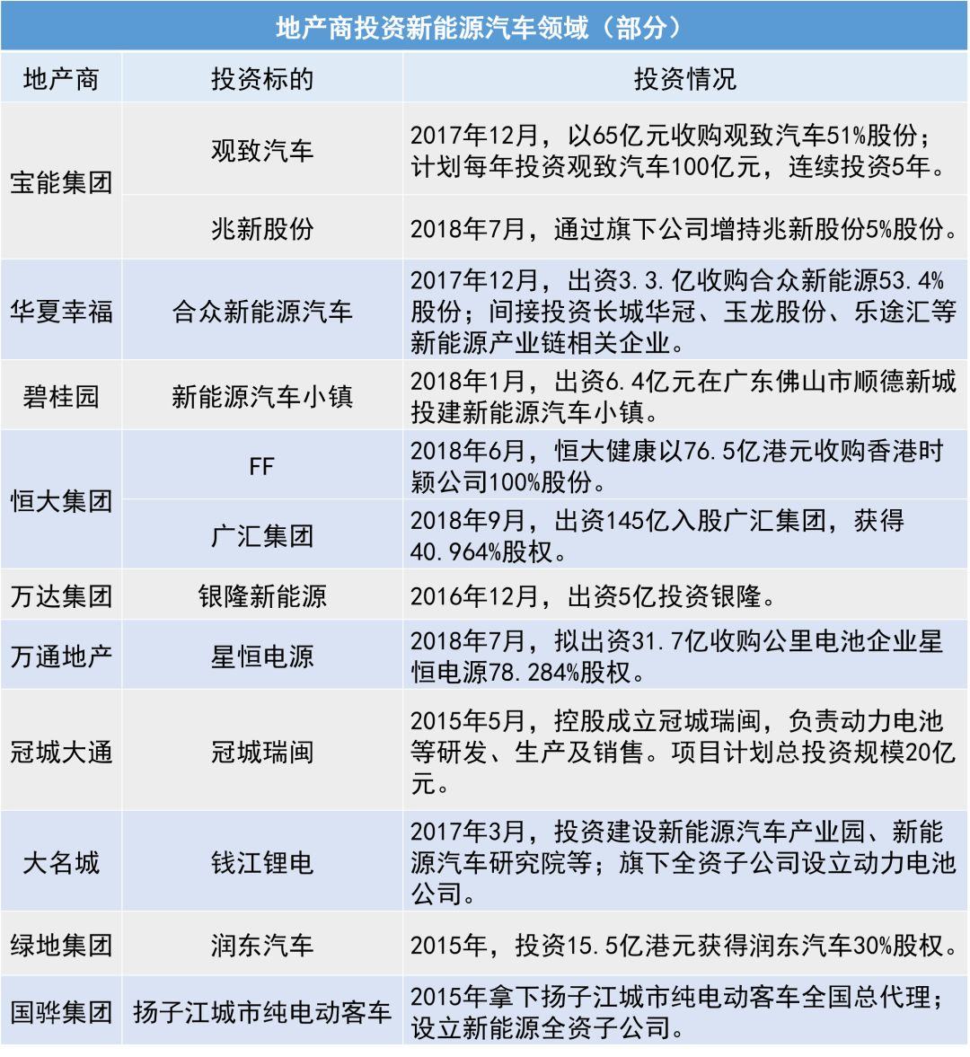 据不完全统计,碧桂园、恒大集团、万达集团、宝能集团、华夏幸福、万通地产、冠城大通、大名城、国骅集团、绿地集团等10家地产企业已经布局新能源汽车产业,2017-2018年投资规模已接近500亿元,而计划总投资更是超千亿。