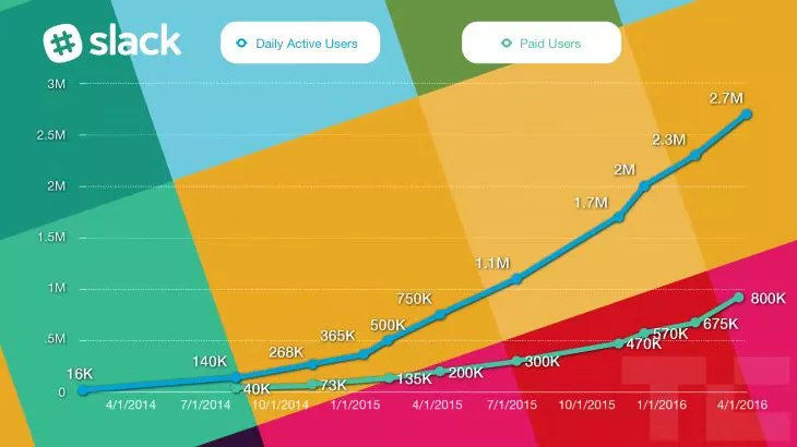 · 2014年10月,不到一年的时间,Slack完成一轮1.2亿美元的融资,拥有7.3万多付费用户,比6个月前增长了386%以上。