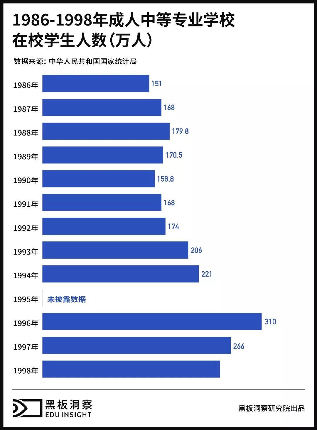 扫盲取得的成效,离不开政府在成人教育上的关注度。根据上文中提到的数据,“40岁以上文盲2.1853亿人”,成人教育进展的好坏或许直接影响着扫盲的效果。当然,成人教育除了扫盲的作用外,也在各方面为各个工作岗位提供了人才培养。(注:下文中,成人中等专业学校是指,改革开放以后发展起来的中等专业成人教育学校,是把有初中文化程度的成年人(主要是在职人员)培养成中等管理人员。)