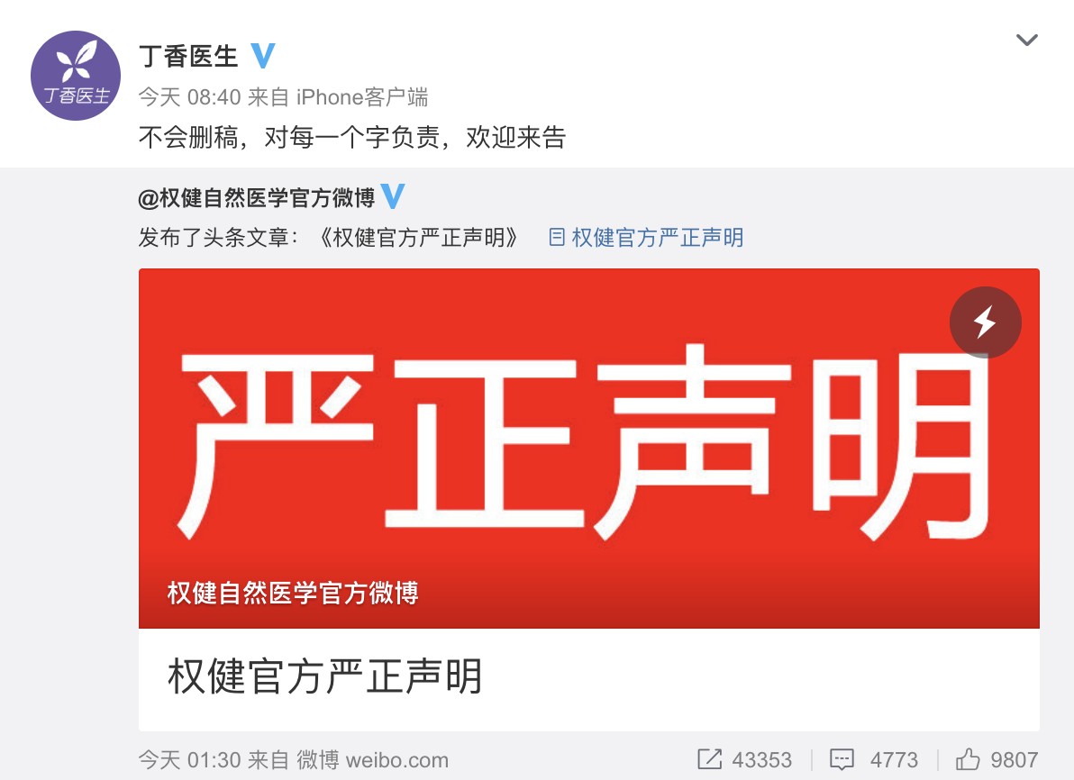 今日凌晨,权健公司急忙发布声明称,上述文章“利用从互联网搜集的不实信息,对权健进行诽谤中伤,严重侵犯权健合法权益,致使社会大众对权健品牌造成误解”。声明还要求发布该文章源平台“丁香医生”撤稿并道歉。