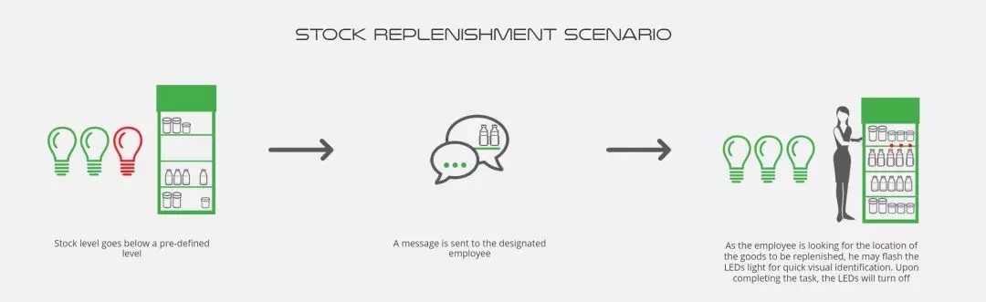 WiseShelf的方案是在货架隔板在下加了很多LED的灯,类似停车场一样加了距离传感器。当把物体放上去灯就灭了,东西拿出来灯就亮了。