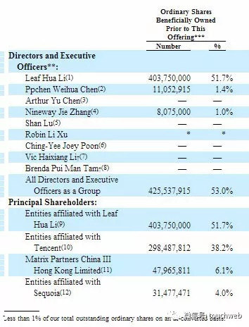 上市前,李华持股51.7%,为最大股东;腾讯持股为38.2%,为第二大股东;经纬持股为6.1%,为第三大股东。红杉持股为4%,为第四大股东。