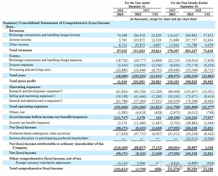 富途证券2018年前9个月净利润为1282万美元,2017年为亏损103万美元。