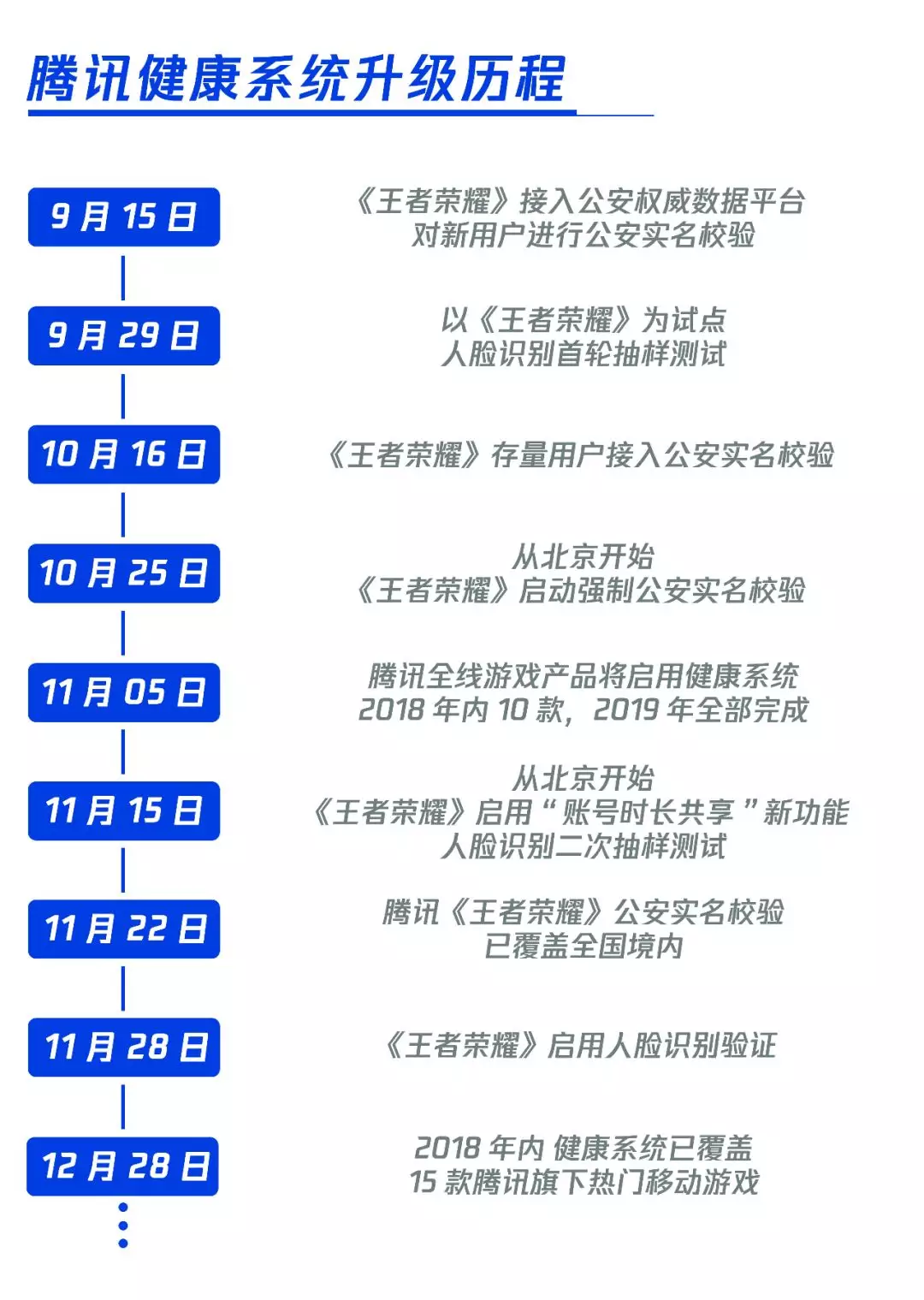 截至2018年底,腾讯旗下共有15款热门游戏产品已接入启用防沉迷健康系统,包括王者荣耀、刺激战场、火影忍者手游和穿越火线等。2019年1月,健康系统还将继续覆盖腾讯其他游戏产品,将在约20款游戏产品中接入并启用,并于2019年内覆盖腾讯旗下全线游戏产品。
