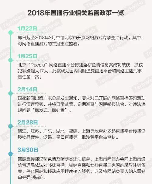 进入3、4月份,监管部门对直播涉黄问题进行集中整治,泛果、星云直播等一批涉黄平台被查封,哆咪直播、猫咪直播和女神直播三家网站被注销,YY、斗鱼、花椒、映客等18家直播、短视频企业被召集开会,要求加强内容安全管理。