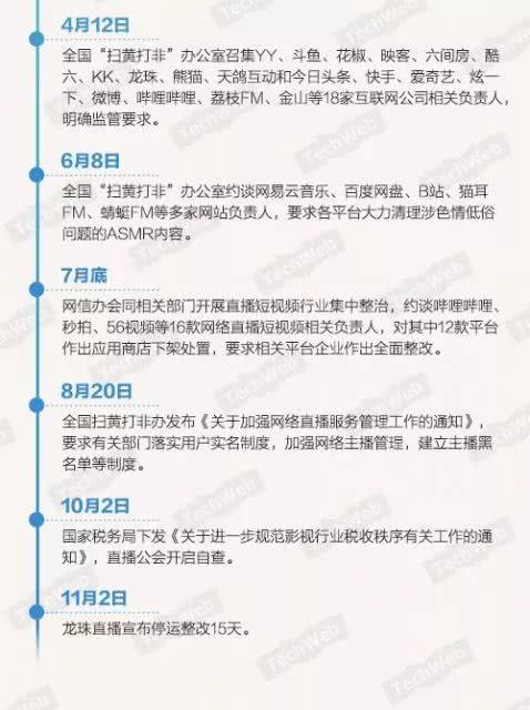8月,全国扫黄打非办发布《关于加强网络直播服务管理工作的通知》,要求有关部门落实用户实名制度,加强网络主播管理,建立主播黑名单等制度。