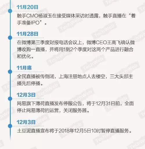 一直播则卖身微博,在微博第三季度财报电话会议上,微博CEO王高飞确认微博收购一直播,并将用1到2个季度对这两个产品进行融合和优化。