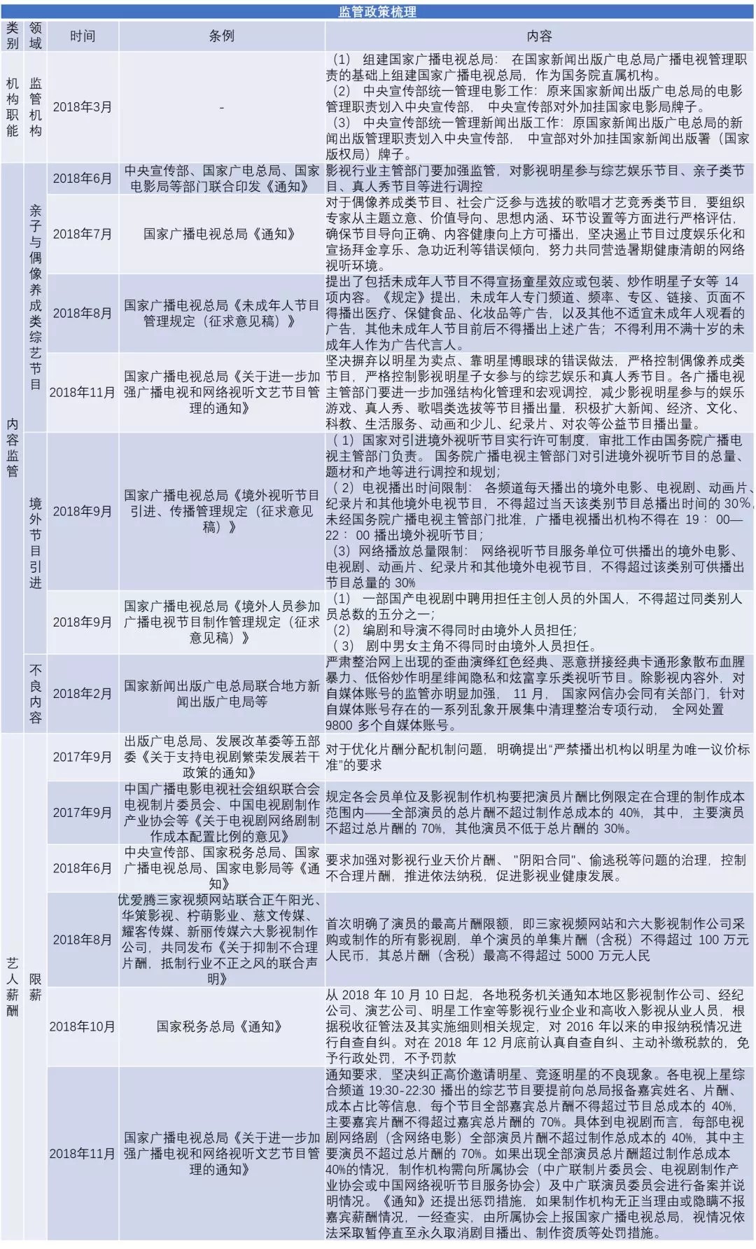 2017年以来,监管机构对影视行业从内容、艺人薪酬、网络视听节目审核三个角度进行全方位的监督和重塑。整体来说,目前的监管思路是在文化娱乐与经济效应的基础上,更加重视影视产业的社会效应与思想宣传作用。