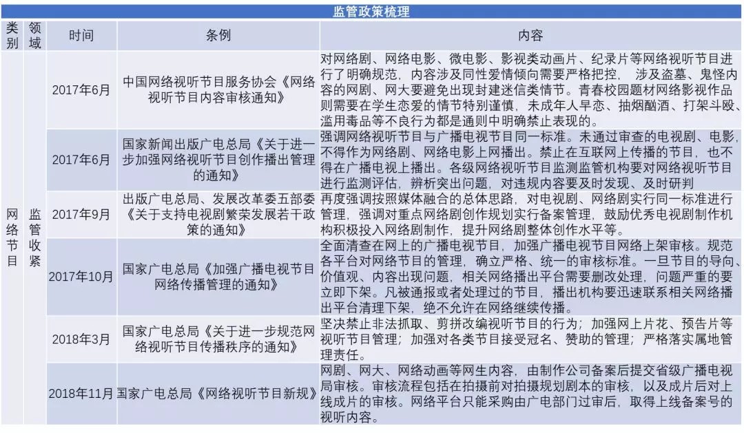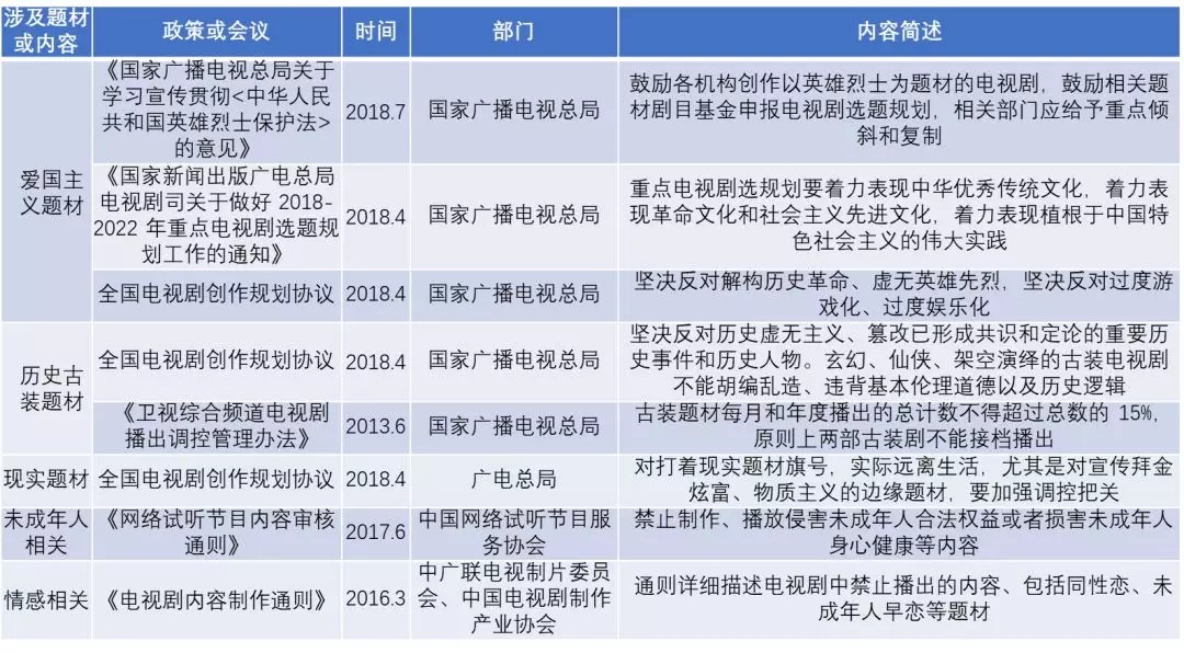 即使能够对剧本进行相对有效的评估,在影视剧整个摄制、剪辑、后期、排挡、宣传、播出的过程中每一个环节都存在着极大的不确定性。其中演员的道德风险(如柯震东、范冰冰、高以翔、黄海波等)、制作团队和主演的敬业精神与制作能力(如游族网络的《三体》、Angelababy主演的《孤芳不自赏》)、监管层对内容题材的调控(如“限古令”等)都是不可忽视的风险敞口。且以上这些风险敞口目前并没有很好的防范和监控手段。下图所列为近年来对于内容题材导向的主要政策。
