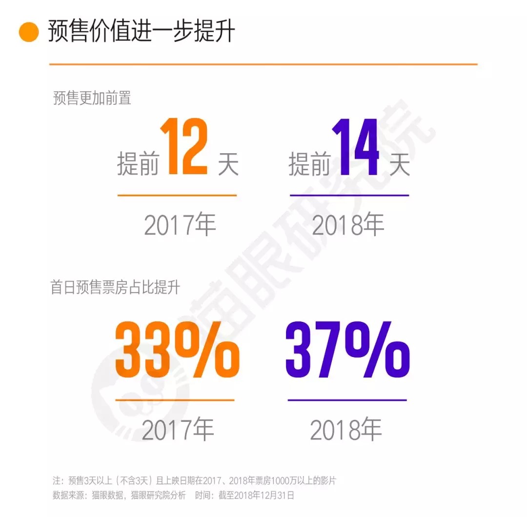 档期竞争加剧、营销难度加大等一系列新挑战,也使得预售、点映等发行手段,在2018年更加得到重视,而且在操作上更加理性、谨慎。据猫眼数据显示,2018年度影片的预售普遍更加提前,首日预售票房占比提升至36%;如《捉妖记2》首日预售达到2.94亿,《复仇者联盟3》达到1.78亿。电影点映规模则更加科学,点映时间更提前,低分点映电影数量减少,如暑期档《我不是药神》通过网络预售的判断,大规模的点映,加速口碑发酵与传播,提前争取了排片。
