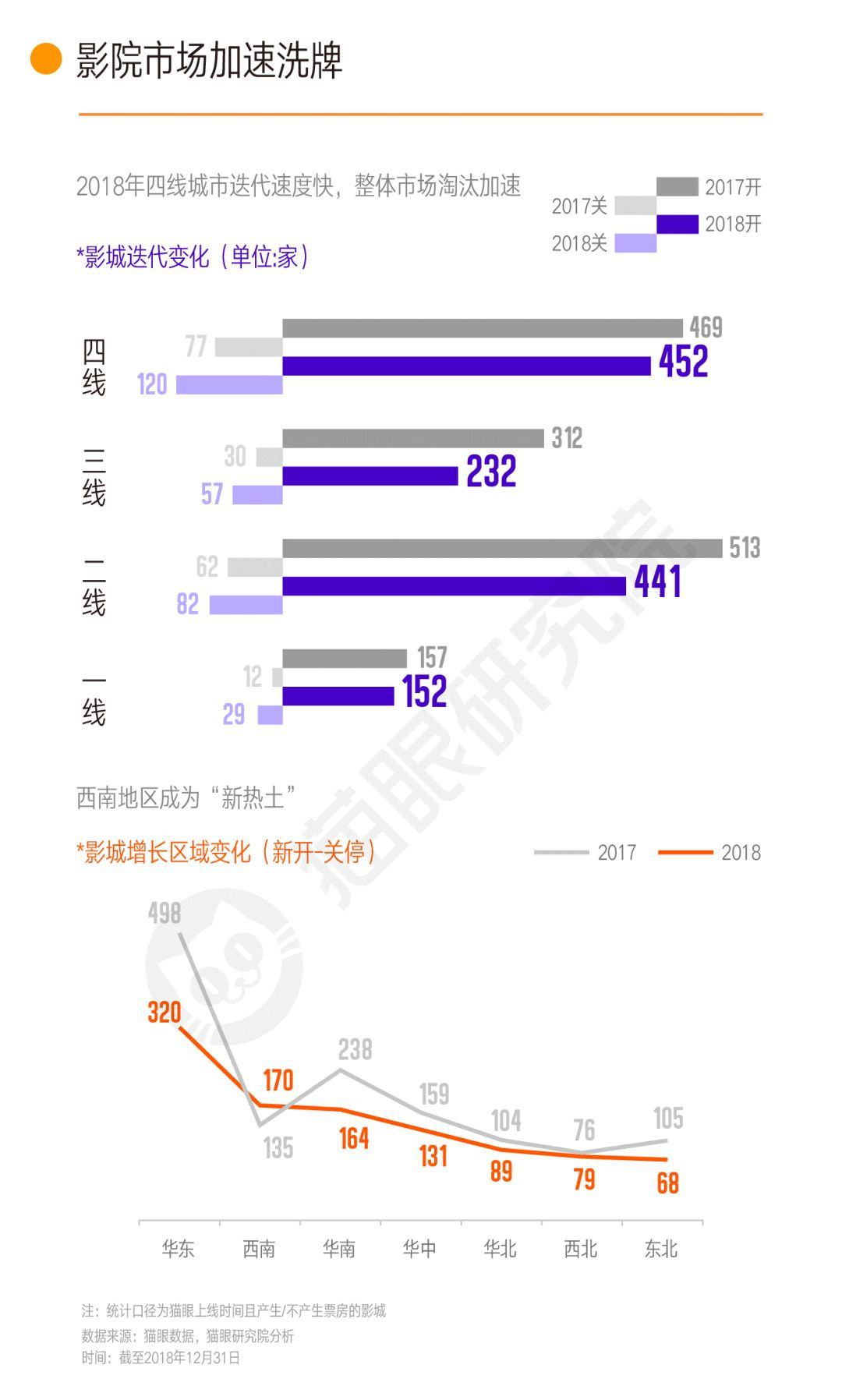 此外,影院市场的洗牌出现加速态势。猫眼数据显示,2018年度银幕总数突破6万块,但单银幕票房产出下降依旧,票房产出没有跟上影院增长规模,影投市场集中度下降,经济效益面临瓶颈,关闭影院数据较往年增长,影院迭代速度加快。