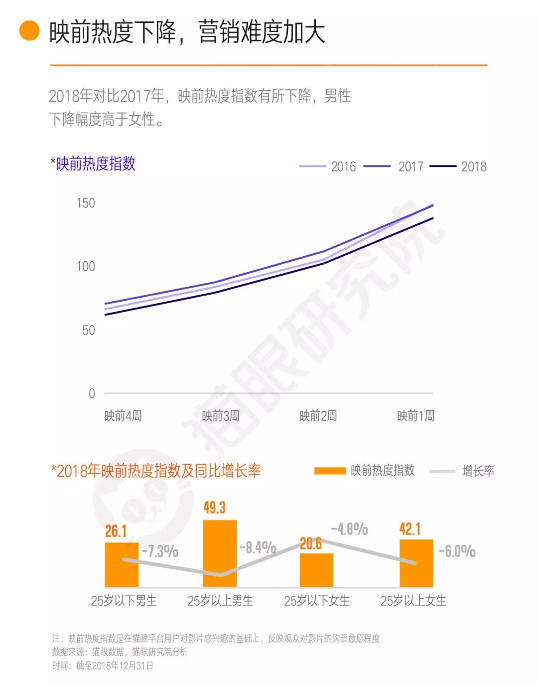 猫眼数据显示,2018年与2017年相比,影片的映前热度指数有所下降,这表达了从业者一种普遍的感受,现在电影营销越来越难做,即使发了多支物料、做了各种花式路演,但还是越来越难以调动起观众的观影兴趣。